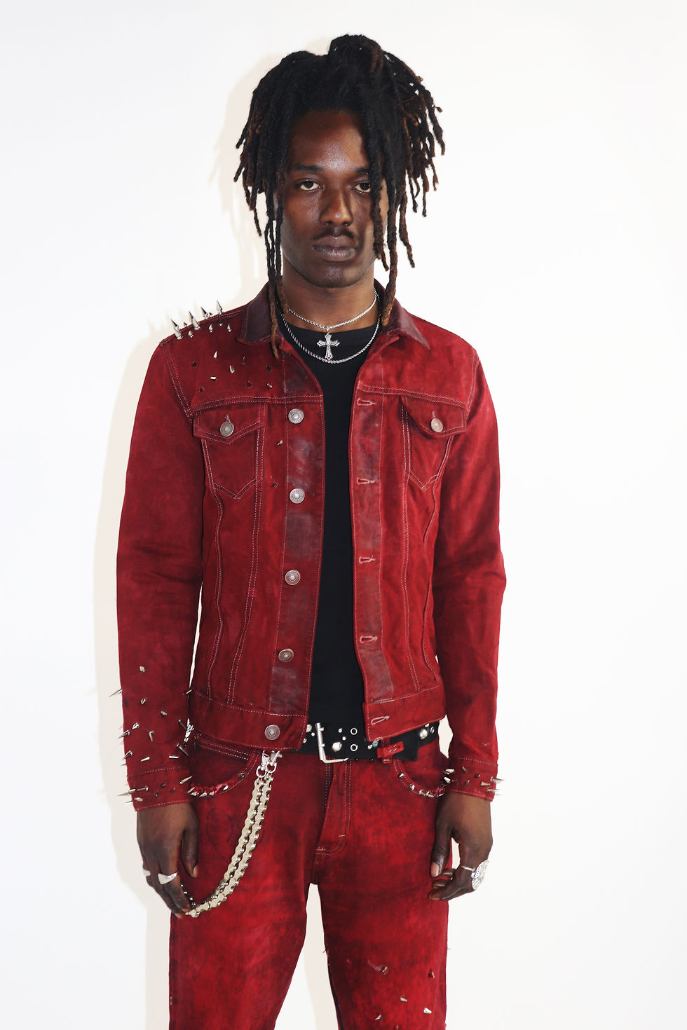 Details: Metallic spikes on pockets and waistband, distressed accents